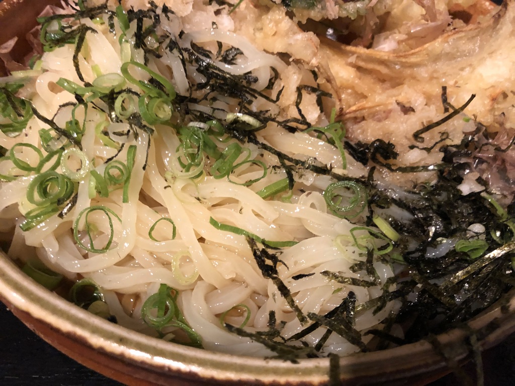 후쿠오카에서 유명하지요. 고보텐 우동을 주문합니다.