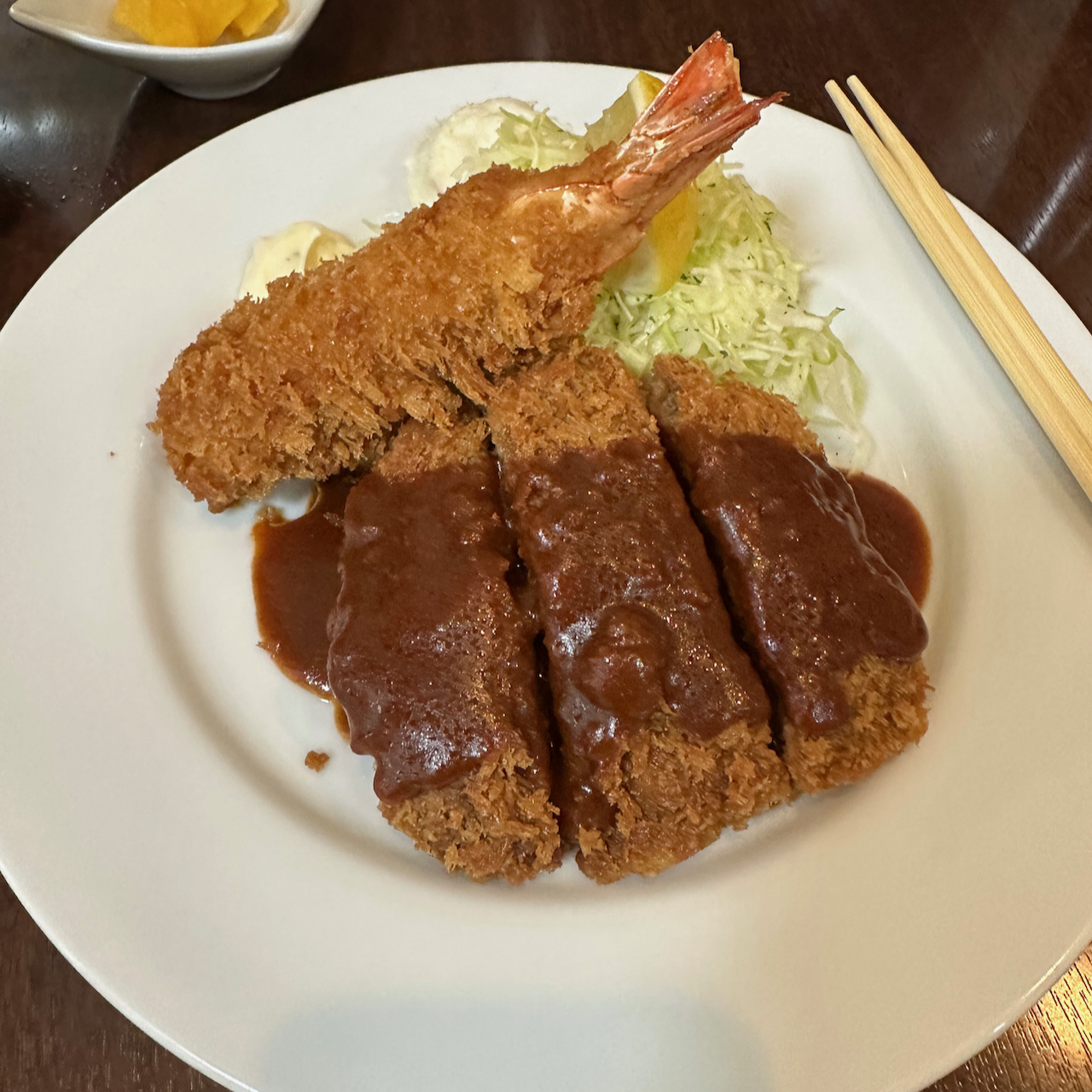 큼지막한 새우와 두꺼운 멘치카츠, 나무랄데가 없습니다.